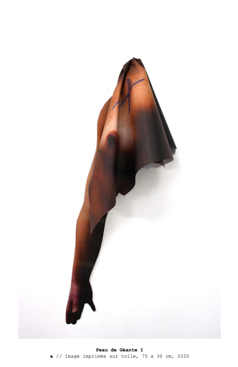 Être un.e géant.e est une métaphore des difficultés que chacun rencontre et surpasse dans sa vie. « Le Géant doit reprendre le coté invisible de la vie que la société ne nous laisse pas apprivoiser et développer à l’heure actuelle », explique l’artiste. Inspirée depuis toujours par les femmes qui l’entourent et celle qu’elle est devenue, Sofie Vangor recourt souvent à l’image des femmes dans son travail. La peau de la géante présentée aux cimaises de La Boverie est celle d’une femme agenouillée, marquée par le tatouage éphémère symbolisant son histoire mais aussi sa résilience. Même éphémères, elle gardera les marques en mémoire. La grandeur d’esprit de cette femme rayonne paradoxalement à sa position de repli. La feutrine utilisée comme support d’impression évoque la peau souple et fragile. Ce corps imprimé et tatoué peut être suspendu, pendu, plié ou posé à même le sol.